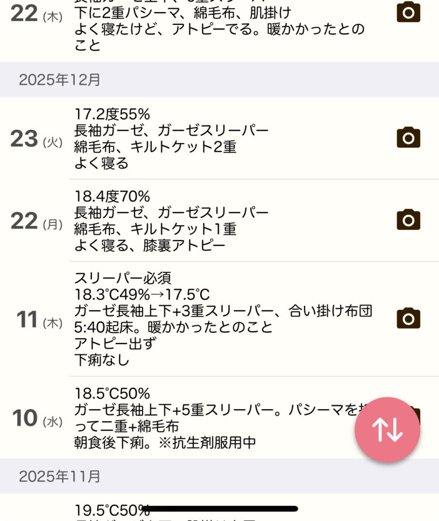 何時に起きたか、アトピーはどうだったかまで入力しておくことで、睡眠がうまくいっていない時にどう対応するかを決められるし、去年はどうだったか確認することもできます。